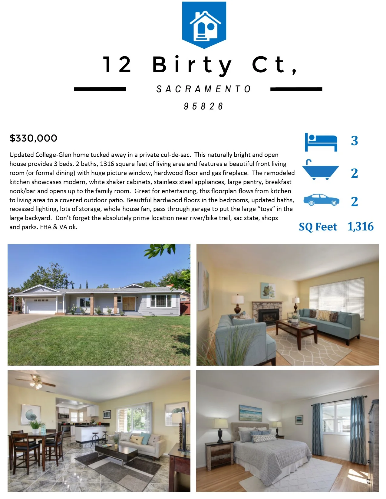 Updated College-Glen home tucked away in a private cul-de-sac. This naturally bright and open house provides 3 beds, 2 baths, 1316 square feet of living area and features a beautiful front living room (or formal dining) with huge picture window, hardwood floor and gas fireplace. The remodeled kitchen showcases modern, white shaker cabinets, stainless steel appliances, large pantry, breakfast nook/bar and opens up to the family room. Great for entertaining, this floorplan flows from kitchen to living area to a covered outdoor patio. Beautiful hardwood floors in the bedrooms, updated baths, recessed lighting, lots of storage, whole house fan, pass through garage to put the large “toys” in the large backyard. Don’t forget the absolutely prime location near river/bike trail, sac state, shops and parks. FHA & VA ok.